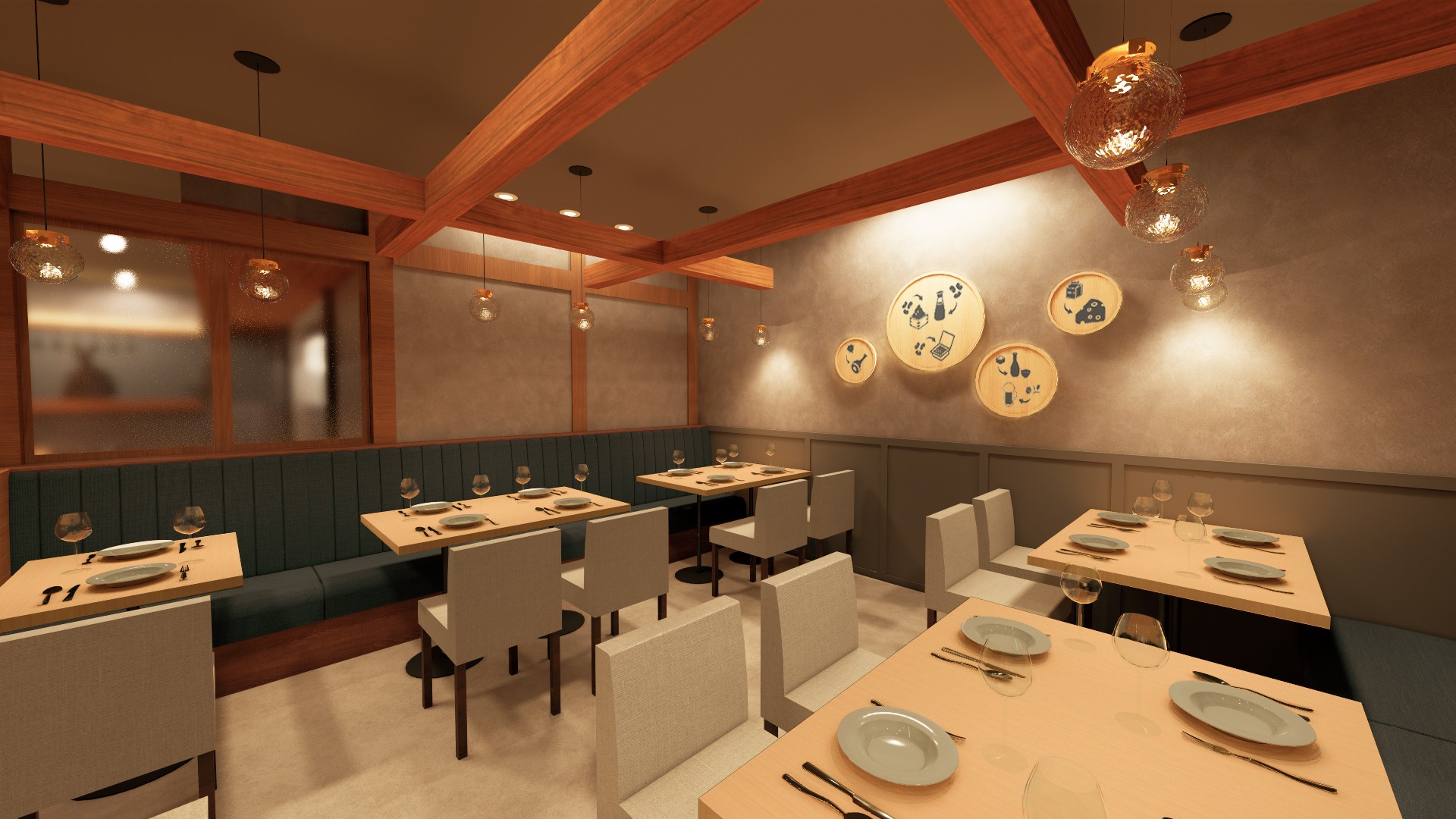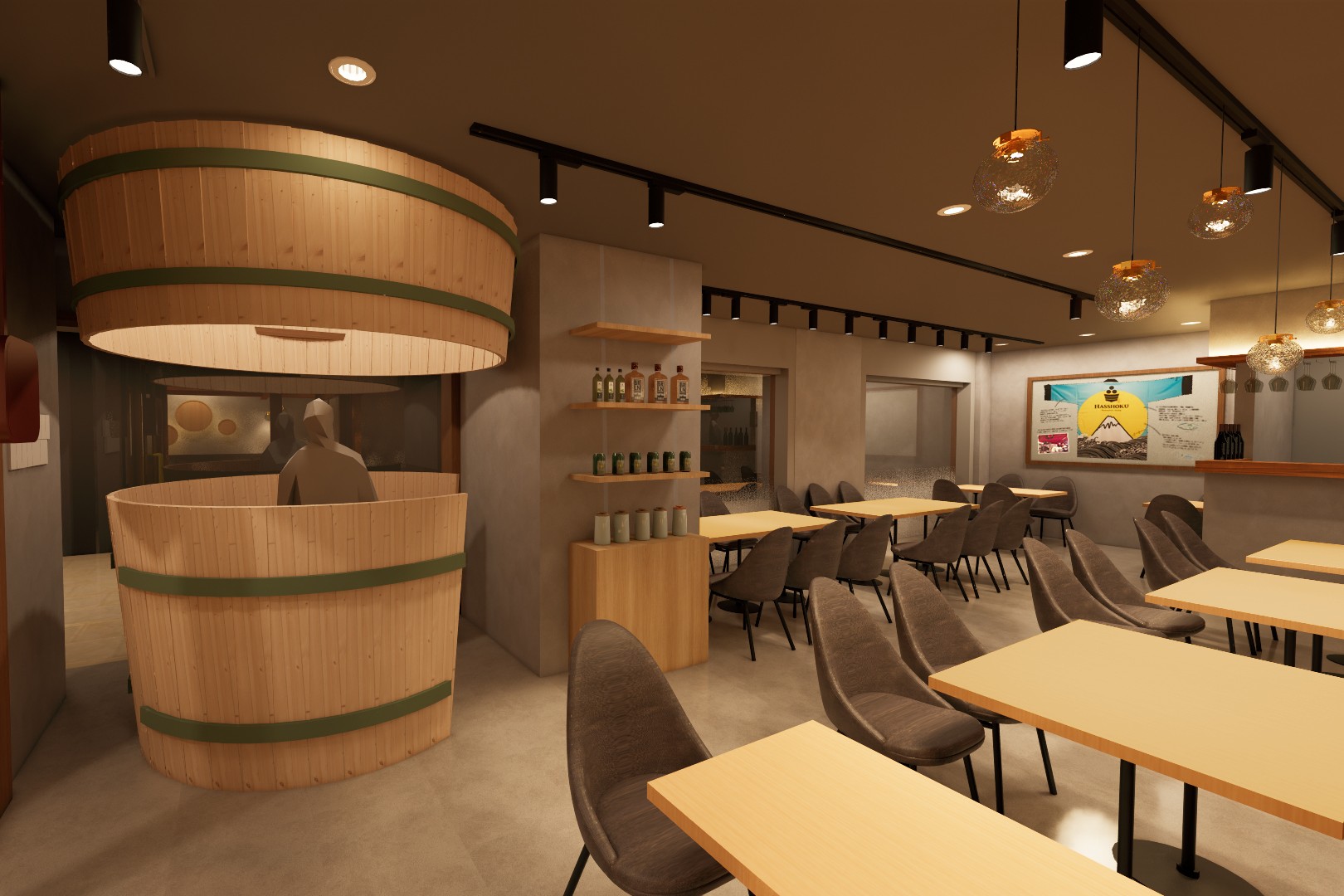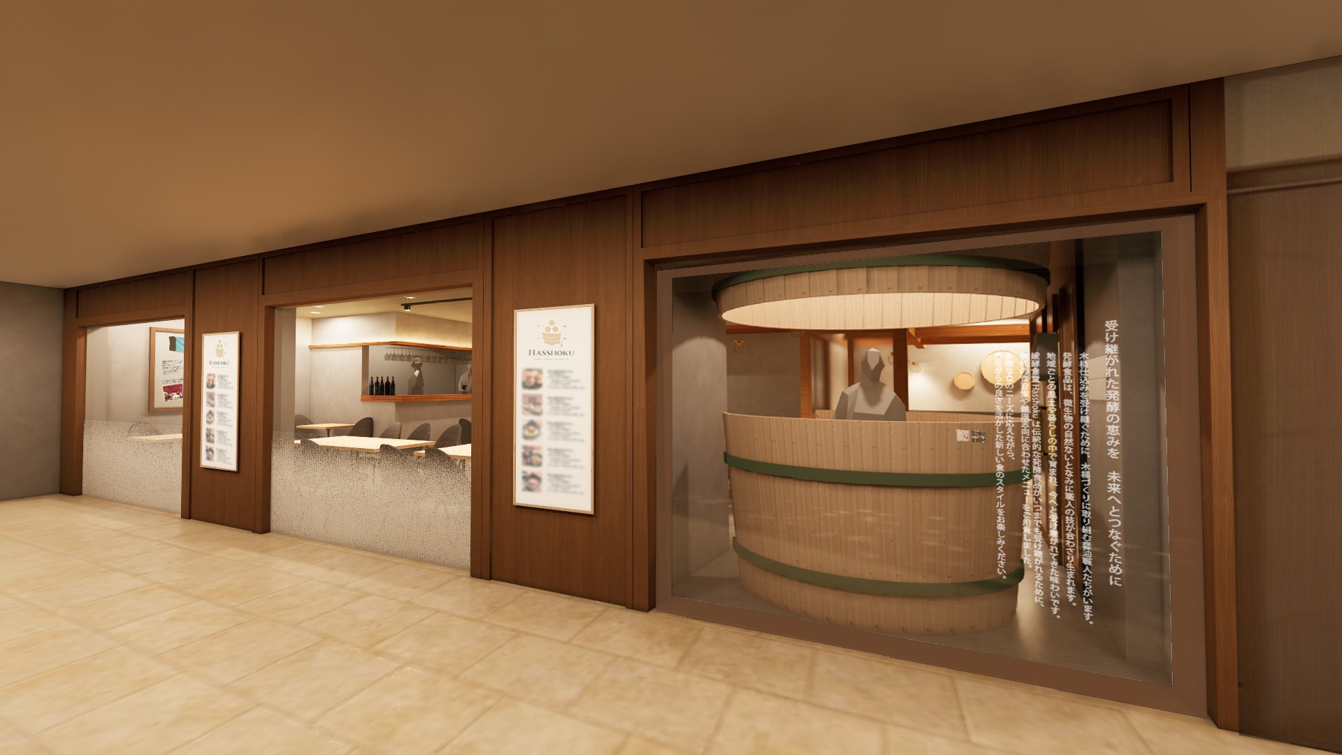 万博会場の店舗は、水上ショー近くのエリア「ウォータープラザマーケットプレイス東」に位置していたこともあり、空や海をイメージした明るく解放感あるデザインでした。一方、当店周辺はビジネスパーソンやヒルトンプラザ利用者が多いため、ベージュやブラウンを基調とし、木桶、樽、瓶など発酵文化を想起させる素材を使って「蔵の温もり×洗練された都会感」を演出します。歓送迎会や同窓会など、大切な方々と集まる際にもご利用いただけるよう、20~30名様向けの貸切個室もご用意いたします。さらに、発酵食文化を自宅でもお楽しみいただくため、木桶仕込みの小瓶醤油「職人醤油」をはじめとする、伝統を繋ぐ全国の作り手の想いが詰まった逸品をそろえた物販コーナーも展開します。