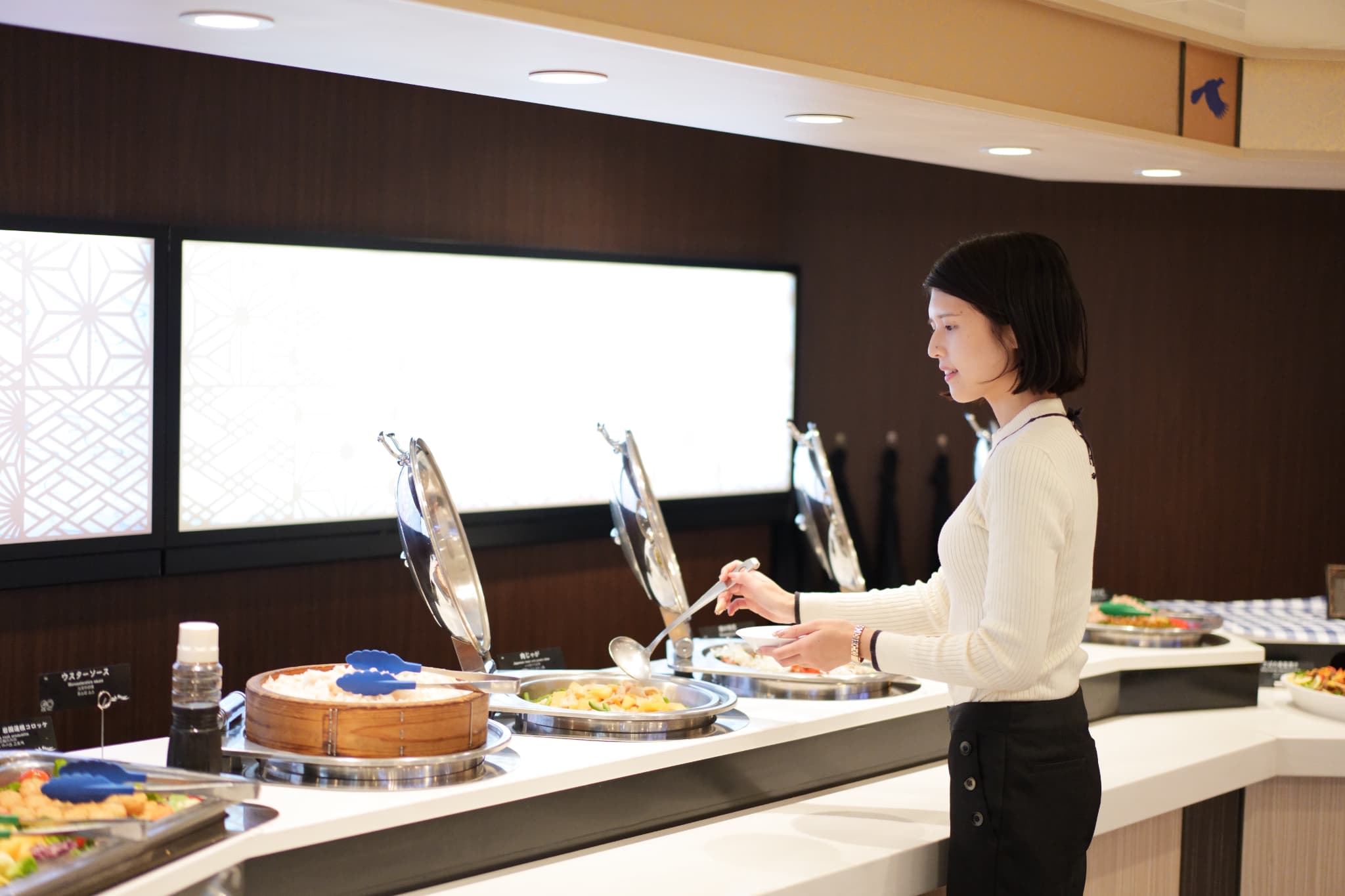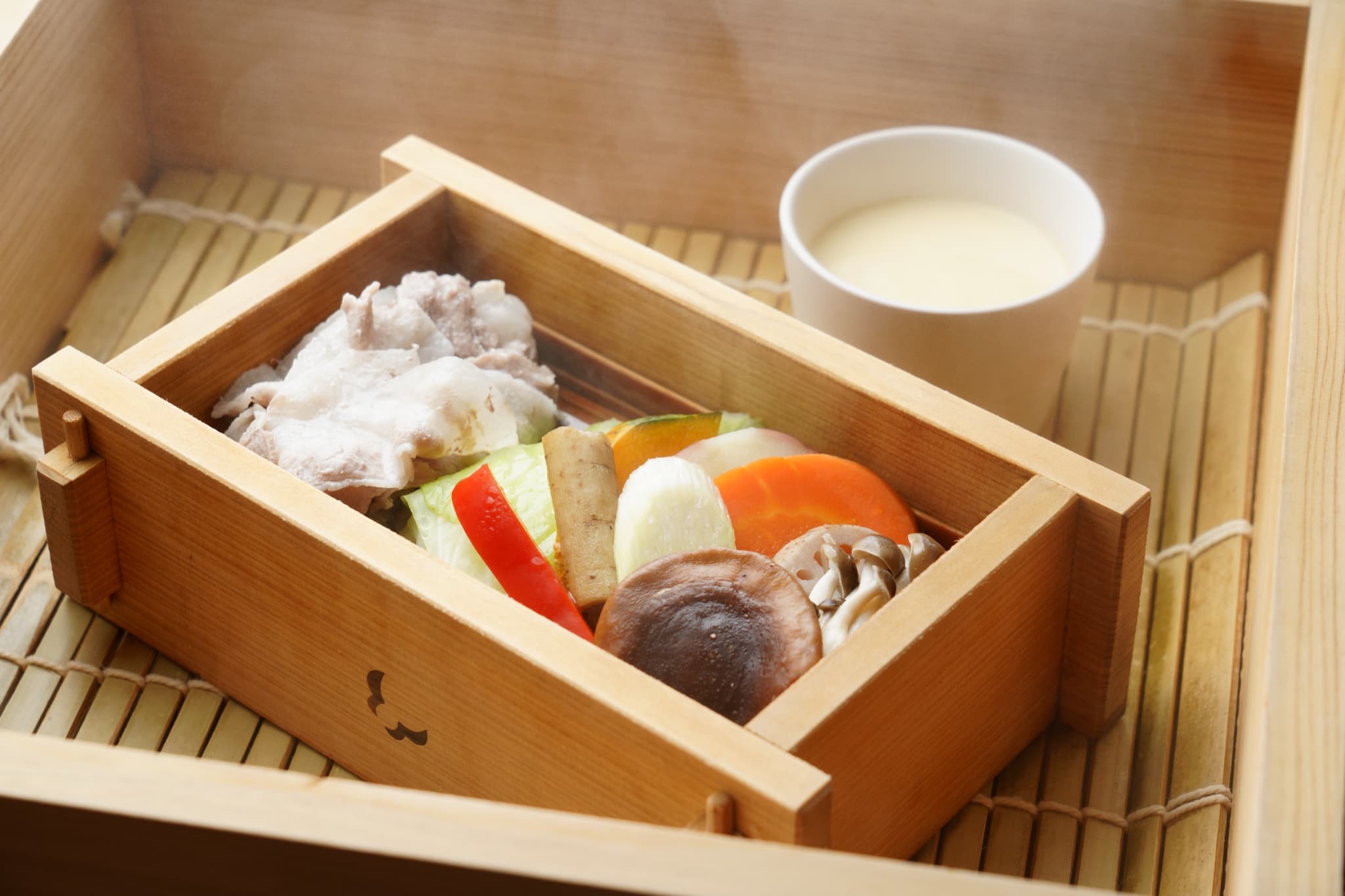 2つ⽬は、船内レストランで登場する南⿅児島限定の特別メニュー。⿅児島県産豚を使⽤した「とんこつ味噌煮」など、現地の味覚を贅沢にご堪能いただけます。さらに、クルーが着⽤するネクタイ&スカーフは、本場・⼤島紬の織元「秀円」特製の特別仕様です。伝統と美が織りなす、南⿅児島ならではのおもてなしをお楽しみください。