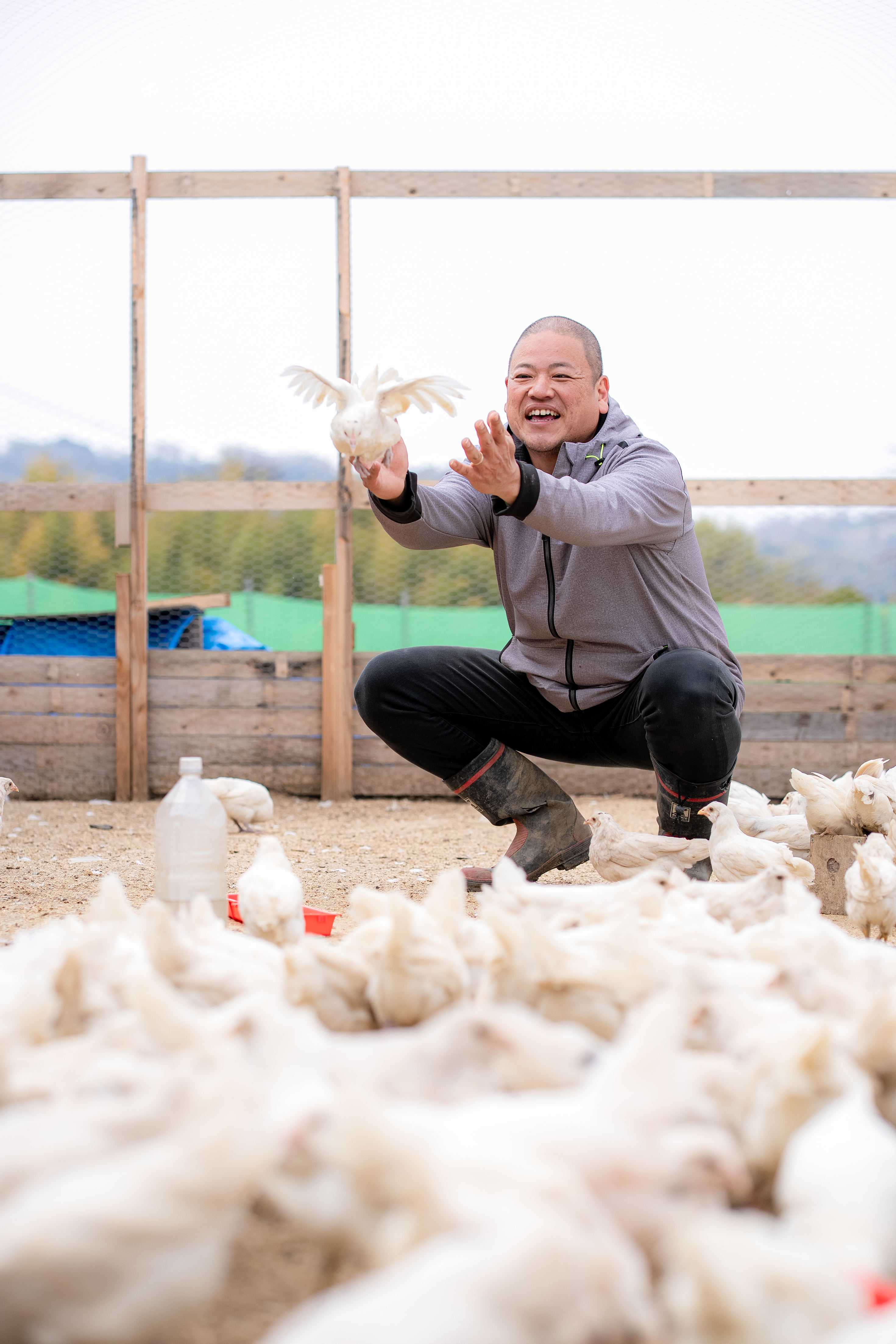 電気・水道・ガスもない尊延寺の耕作放棄地を、工務店を経営していた時の知識を活かして切り拓き、鶏舎を建設。「鶏が鶏らしく生きられる環境」を追求し、臆病なアローカナがのびのびと育つ「完全平飼い」を実現しました。今も毎朝5時に起き、鶏たちのお世話をしています。