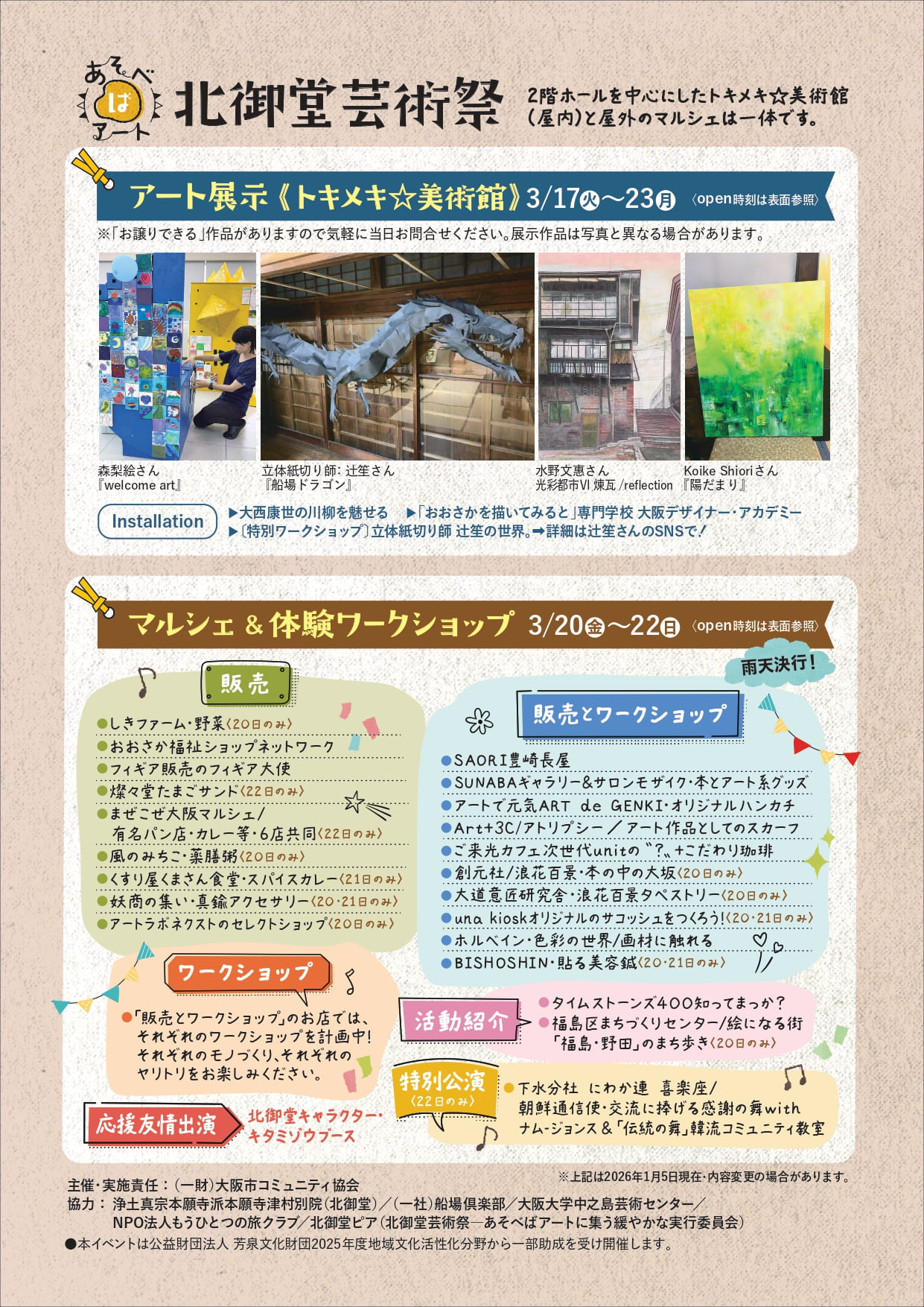 地域コミュニティ事業を手掛ける、一般財団法人大阪市コミュニティ協会(所在地:大阪市中央区船場中央1丁目3番2-302 理事長:大垣純一)は、「北御堂芸術祭あそべばアート」を開催します。