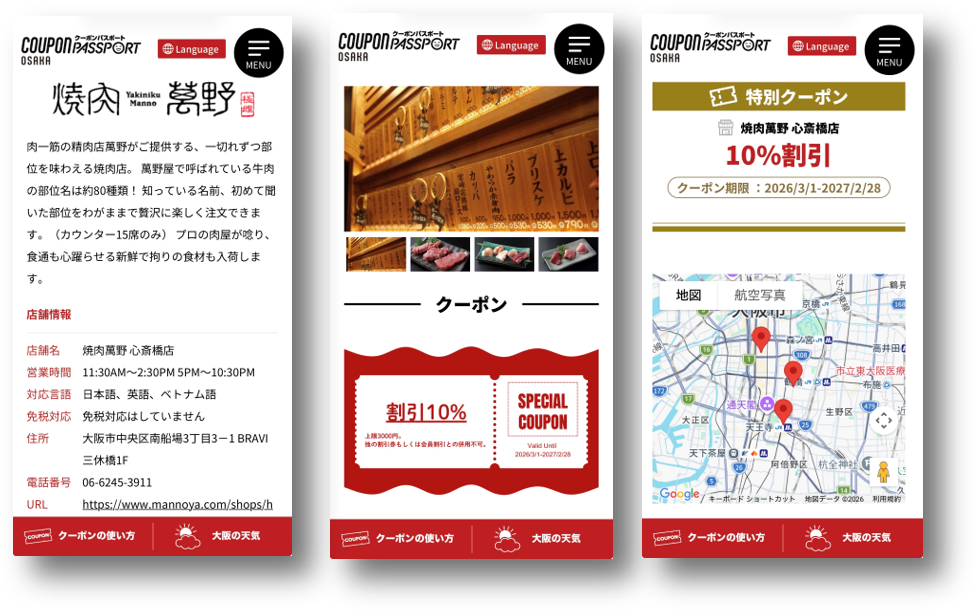 「クーポンパスポート」は、観光客向けにクーポン付きの店舗情報を発信するサービスです。 2014年12月に冊子状の「クーポンパスポート大阪」の発行を開始し、2025年9月に福岡博多版(年間9万部、約250カ所)、2026年3月に大阪堺版(年間3万部、約50カ所予定)に拡大しています。
