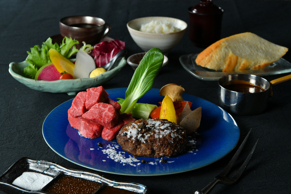 主役となるのは、鉄板で調理する国産牛のサーロイン・フィレステーキ、そして黒毛和牛100%のハンバーグ。黒毛和牛はあえてA4等級を使用。サシの華やかさだけを追うのではなく、脂と赤身の調和を大切にしました。噛むほどに広がる旨みと、すっと消えていく後味の軽やかさ。その絶妙なバランスが、最後のひと口まで心地よい満足感を生み出し、重たさを残さない心地よい余韻が特長です。