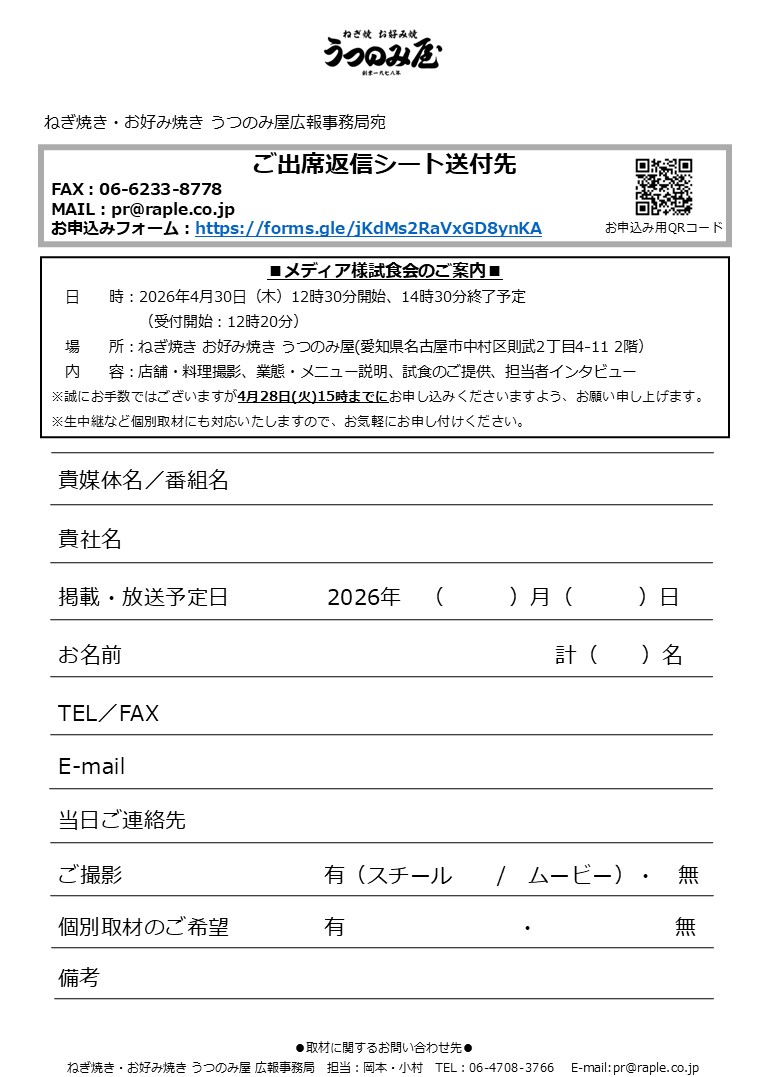 「ねぎ焼き お好み焼き うつのみ屋」(愛知県名古屋市中村区則武2丁目4-11 2階)が2026年5月1日(金)、名駅西にオープンします。オープンに先立ち、4月30日(木)にメディア様向け試食会を開催いたします。