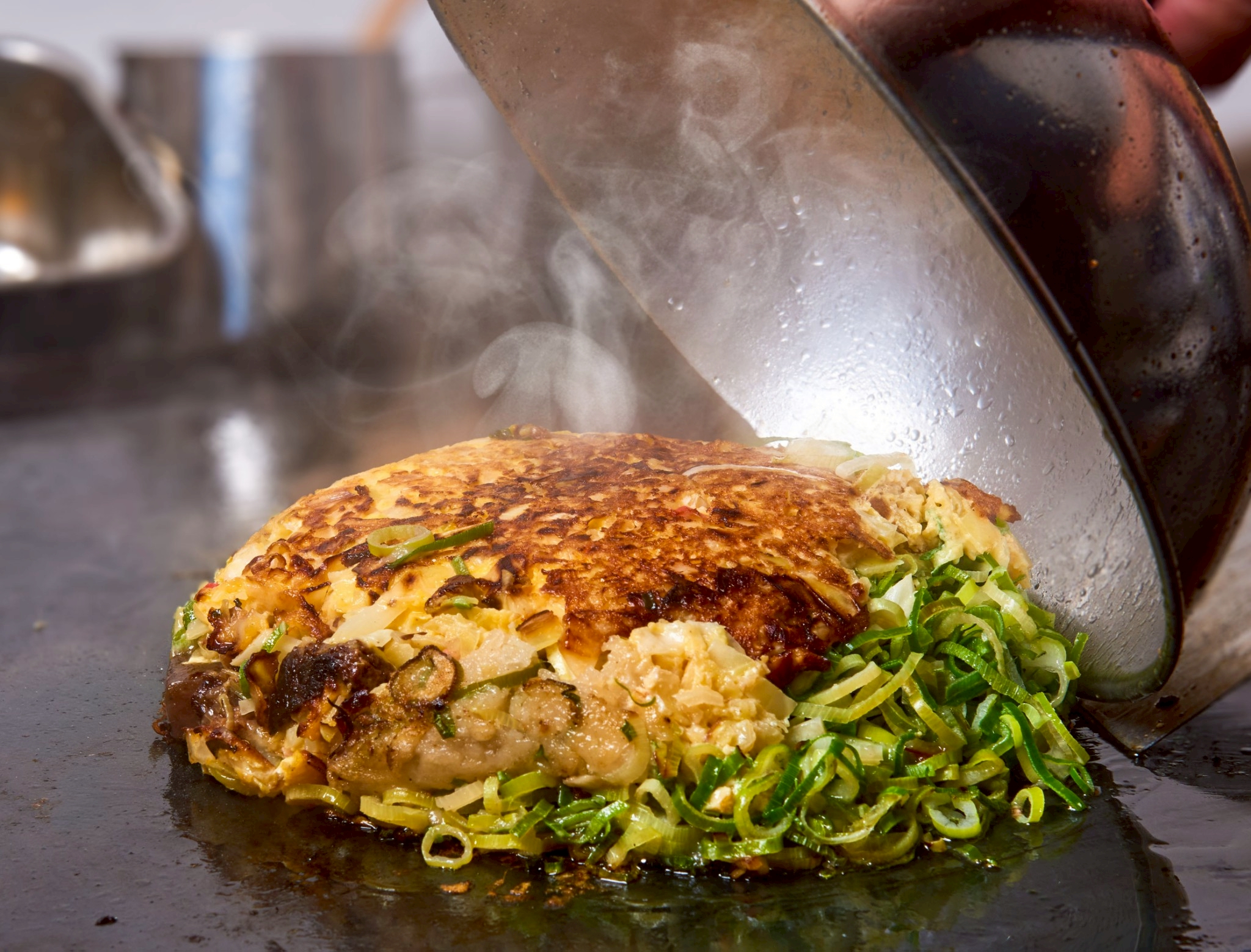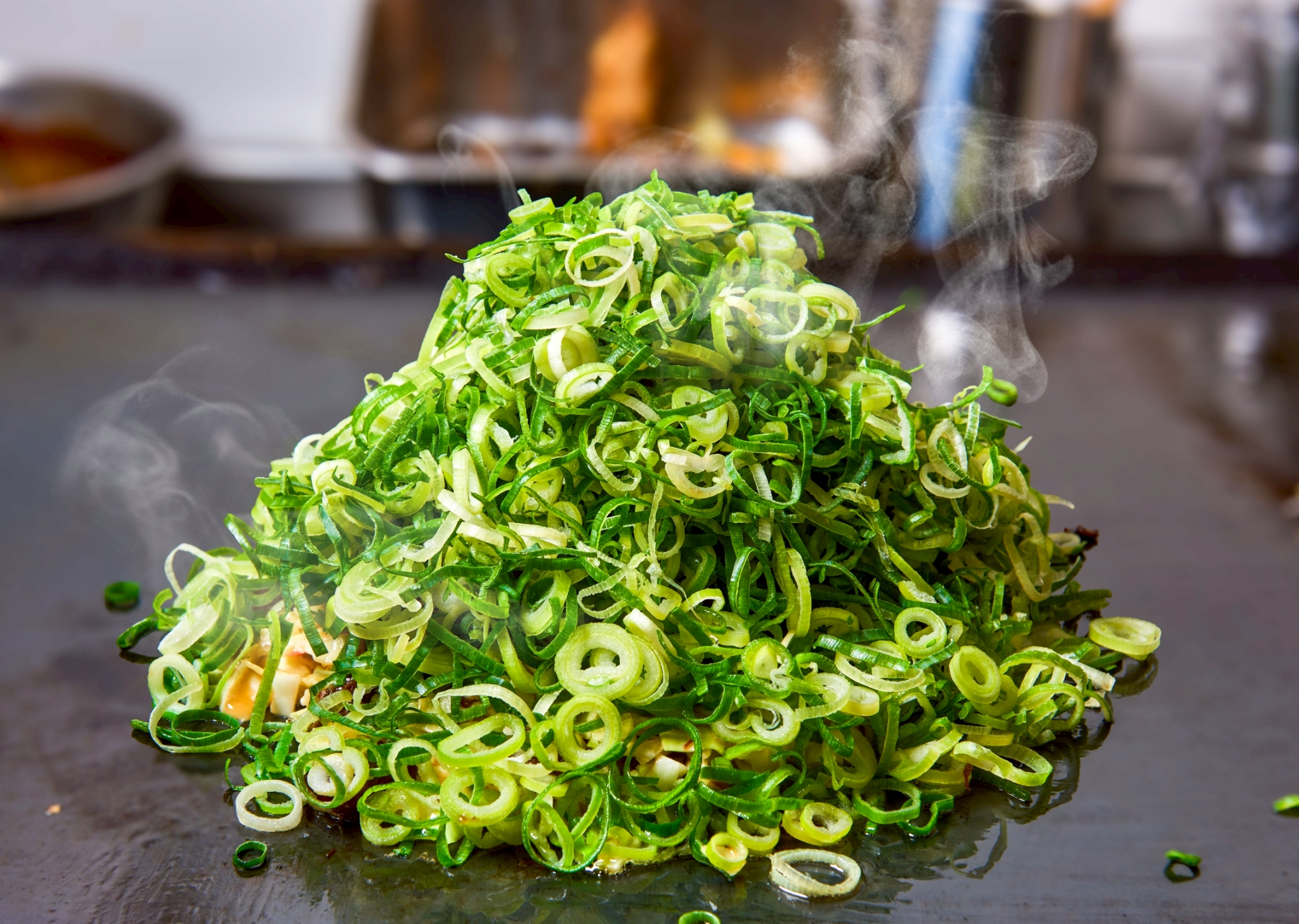 → 山盛りの青ネギをのせ豪快に焼き上げる様子は、写真・動画映え抜群