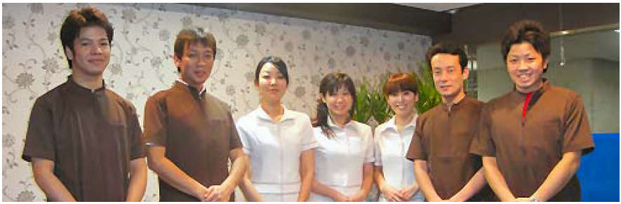 ↑医師の白衣を廃止しました。 ※左から2人目が院長の橋本です(神戸出身の体育会系歯科医。学生時代にアメフト全国優勝も経験)。
