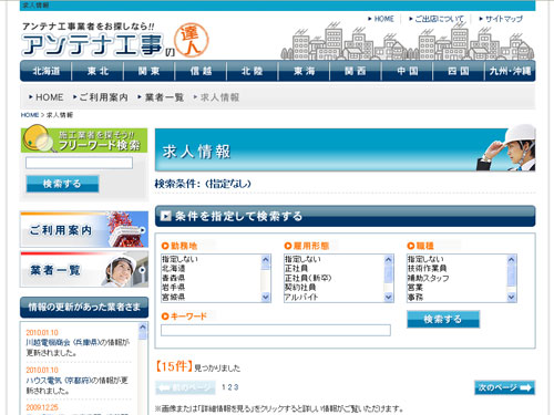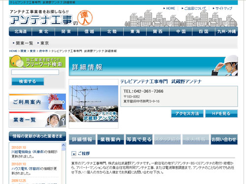 「アンテナ工事の達人」では、地域を指定してアンテナ工事業者の検索が可能で、各業者の情報は電話番号や住所はもちろん、施工例や料金、施工スタッフなどの情報まで充実しており、また求人情報なども掲載されている。