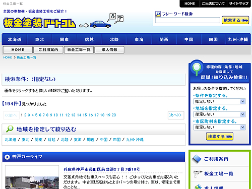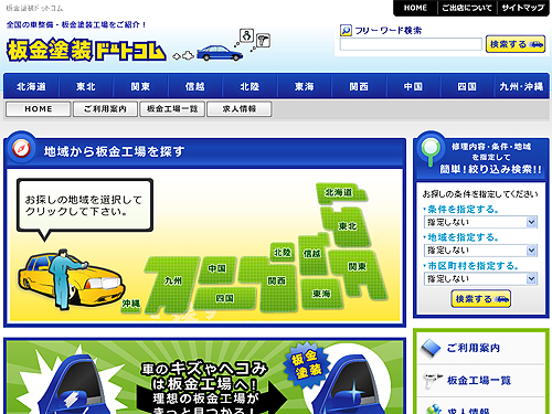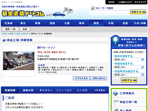 「板金塗装ドットコム」では、条件や地域を指定して車整備・板金塗装工場の検索が可能で、各工場の電話番号や住所はもちろん、施工例、施工スタッフなどの情報まで充実しており、求人情報なども掲載されている。