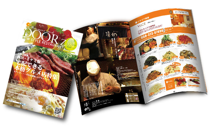 料理デリバリー業界は各店舗が個々にポスティング等による広告で注文を受けるスタイルが主流な中、宅配注文客はたくさんのチラシがポストに入っていても必要な分だけ保存し、その他はすべてゴミ箱行きというのが現状です。それを一冊のグルメ本としてまとめ、さらにその本に掲載されている料理はすべて近隣の実際に営業しているお店であれば宅配注文客はこのグルメ本を保存すると考えます。ドアーズグルメブックはそのような要望にお応えした飲食店舗の料理ばかりが掲載された宅配できるグルメ雑誌です。