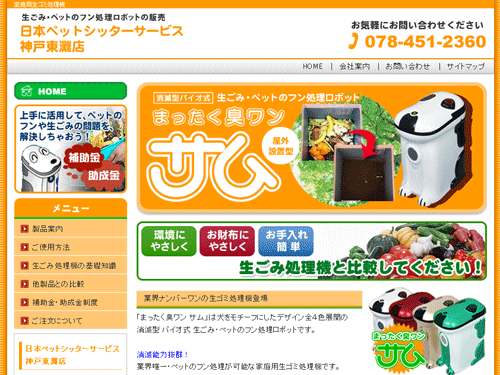 「サム」は犬をモチーフにしたデザイン全4色展開の消滅型 バイオ式 家庭用生ゴミ処理機です。消滅能力が素晴らしく、分解率 99.8%(24時間測定)で、ペットのフン処理が可能な業界唯一の家庭用生ゴミ処理機です。