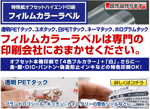 【印刷の職人さん】に新製品「フィルムカラーラベル」登場!透明PETタック、ユポタック、白PETタック、ネーマタック、ホログラムタックなど特殊紙タックをハイエンドオフセット印刷でフルカラー、1000枚からの小ロット対応。特色OK!偽造防止インキOK!