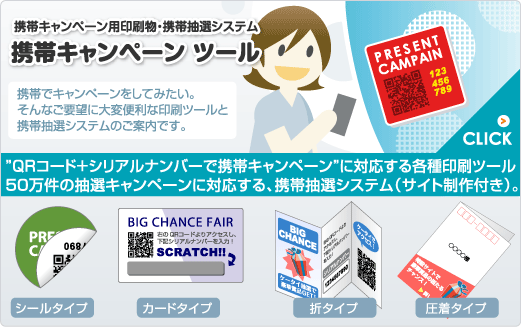 携帯キャンペーンなら「携帯キャンペーンツール」にお任せ!キャンペーンに必要なナンバリング印刷物と、携帯抽選システムをワンストップで提供。