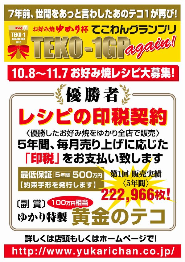優勝者にはお好み焼印税の契約の他に「ゆかり」が製作した純金の黄金のテコ100万円相当を副賞にプレゼントするものとします。