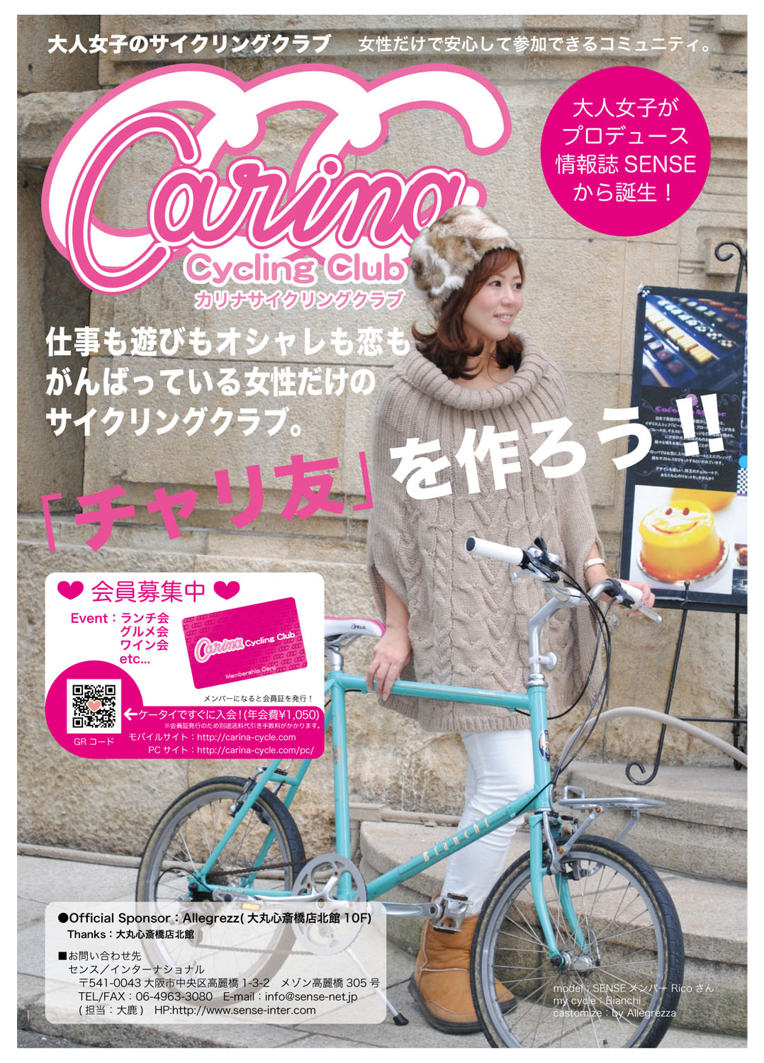 情報誌SENSEから誕生した大人女子だけのサイクリングクラブ。大阪の中心で仕事も遊びもオシャレも恋もがんばっている女性にもっとオオサカライフを楽しんでもらう為に、女性だけで安心して参加できる情報誌SENSEのオフィシャルサイクリングクラブです。