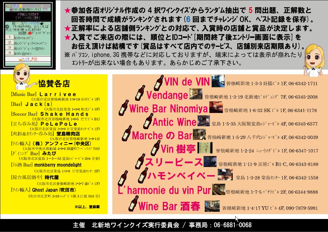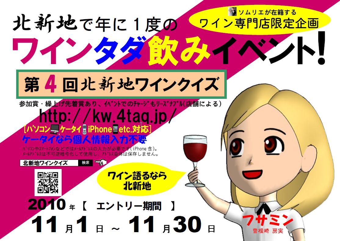 ワインの消費定着とさらなる拡大に伴い、北新地でもワイン専門店の出店が増えており、こうした動きを北新地全体の地域活性化にもつなげていこうという企画で、今年で4年目を迎えます。参加はパソコンや携帯からイベントのWebサイト(http://kw.4taq.jp/)のクイズにエントリーし、上位30名までに入賞すれば、順位に対応した参加店で独自に準備した賞品(ワインを主とした飲食サービス)の提供を受けることが出来ます。クイズはすべて参加各店がオリジナル作成したワインに関するもので、店舗により、入賞以外にも参加賞や期限まで来店のなかった賞の繰上げ、イベントでのチャージ無料などもあります。ワイン愛好家でも社用族中心の北新地には日ごろ足を運ぶことがなかった方など、このイベントで専門家の世界に気軽に触れることができ、また最近訪れやすくなっている北新地をあらためて知っていただける機会にもなっておりますので、ワインを愛する多くの方にご参加いただきたく思っております。