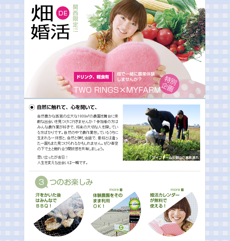 農業ベンチャーの株式会社マイファーム(本社:京都市中京区、代表:西辻一真)は、結婚紹介ベンチャーのTwo Rings株式会社(本社:東京都中央区、代表:村田達彦)と共同でサービス化の準備を行っていた、「農業+婚活」を5月9日にマイファーム西宮にてイベントを開始いたします。マイファームが行っている体験農園においての年齢構成が20代後半から40代中盤であることを受けファミリー層以外のその世代の方にもニーズがあるのではないかとの予想から婚活カレンダーを運営するTwo Rings社と共同で同イベントをスタートさせました。