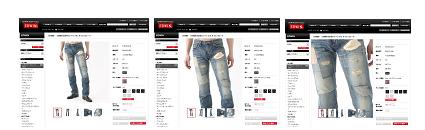 ジーンズ特有の縦長の画像を1ページ内でズーム出来るように、ズーム時は表示領域をサムネイル部分の下まで大きくしました。