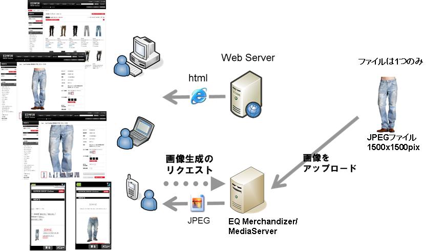 画像1ファイルの登録だけでPC/ケータイ両サイトのサムネイル、詳細画像など、複数サイズの画像をオンデマンド生成できるため、管理するファイルが1つだけで済むようになりました。またケータイサイトにおいては画像容量サイズの制限もあり、アップロード後に容量サイズ上限以下になるような変換処理を行いました。