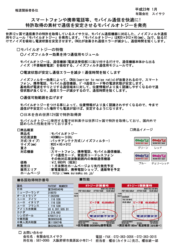 スマートフォンや携帯電話、モバイル通信を快適に! 特許取得の素材で通信を安定させるモバイルオトジーを発売