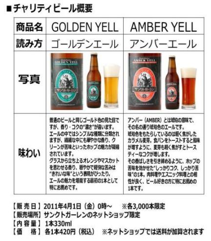 サンクトガーレン有限会社(神奈川県厚木市/取締役社長 岩本伸久)は2011年4月1日(金)より、売上の一部を東日本大震災の被災地に寄付するチャリティビール2種類『GOLDEN YELL(ゴールデンエール)』と『AMBER YELL(アンバーエール)』を各3,000本、インターネット限定で発売致します。※売上の40%程度を寄付させて頂く予定です。