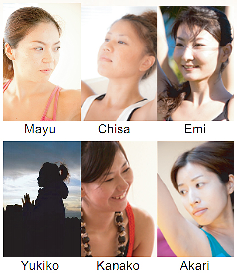 Mayu 「ウェイクアップヨガ」 / Chisa 「ハートオープン!癒しのヨガ」 / Emi「心♥ヨガ」 / Yukiko 「心をクリアに☆リフレッシュヨガ」 / Kanako 「ヨギックアーツ」 / Akari 「サンセットヨガ」