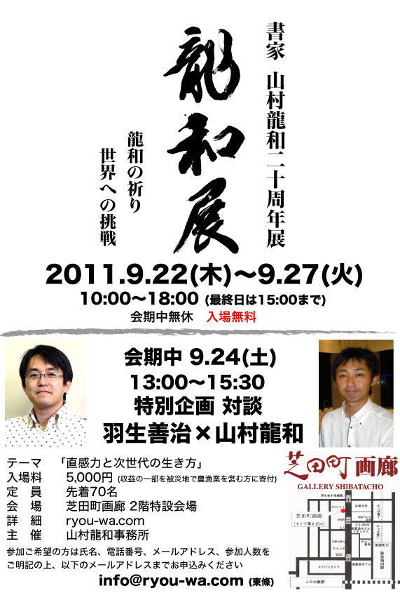 書家 山村龍和20年展 緊急特別対談 羽生善治×山村龍和 ~平和の祈りと愛、収益を東北地方、台風12号被災地に寄付~