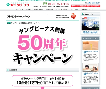 このキャンペーンは、キャンペーン対象商品に貼り付けてある「点数シール」10点分(商品1,000円につき1点の点数シールが貼ってあります。) を商品に同封の応募用ハガキ、または官製ハガキに貼り付け、必要事項を明記の上、ヤングビーナス薬品工業 50周年キャンペーン係へ郵送すると、応募者全員にもれなくQUOカード 500円券を1枚プレゼントするものです。