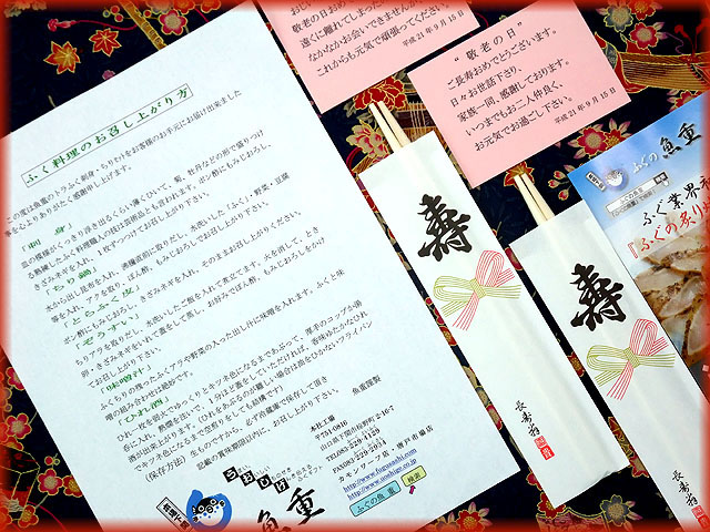 1.今ならポイント4倍!お祝い箸と7種類から選べるメッセージカード付きの、敬老の日に感謝と愛情を込めてふぐを贈る『敬老の日特集』
