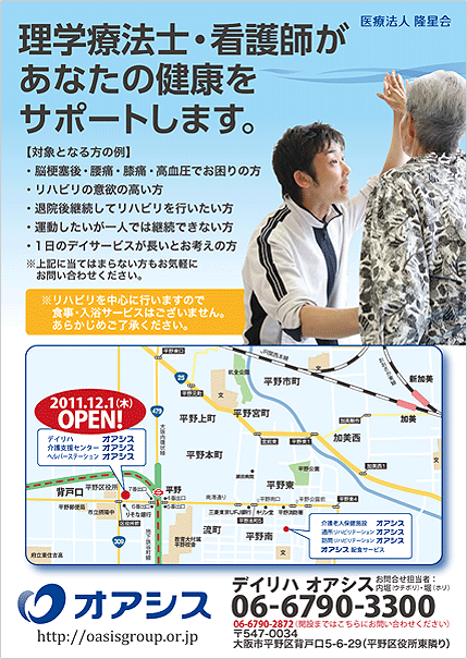 医療法人隆星会(法人本部:大阪府大阪市平野区平野南1丁目7-7、理事長 木下真一)は、平成23年12月1日(予定)、大阪市平野区役所東隣りに、短時間のリハビリデイサービスをオープンします。