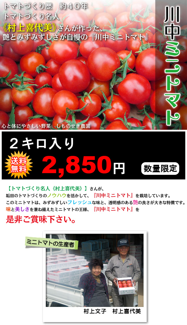 ~トマトづくり歴約40年 トマトづくり名人《村上喜代美》さんが作った、艶とみずみずしさが自慢の『川中ミニトマト』~