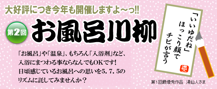 本川柳キャンペーンは、「お風呂」や「温泉」、「入浴剤」など、お風呂や入浴にまつわる思いを五・七・五のリズムで表現していただき、改めて日本の良き「お風呂文化」を考えてみようという企画です。
