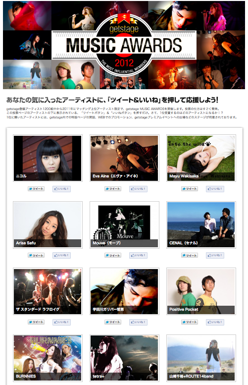 第一弾として、getstage 内の人気アーティストナンバー1を決定する『getstage Music Award 2012』から、本プラットフィームの活用を開始いたします。