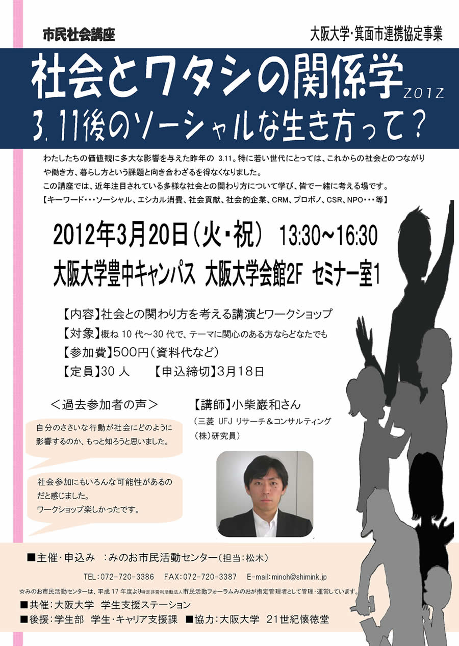 箕面市立みのお市民活動センター(NPO法人市民活動フォーラムみのおが指定管理者として運営)は、この度、大阪大学・箕面市連携協定事業の一環として、3月20日(火・祝)13:30~16:30、大阪大学豊中キャンパス内において、市民社会講座「社会とワタシの関係学2012 ~3.11後のソーシャルな生き方って?」を実施します。対象は概ね10代~30代で、今後の市民社会を担う若者に、社会との関わり方を講座形式で学んでもらいます。講師は三菱UFJリサーチ&コンサルティング(株)研究員の小柴巌和さんです。