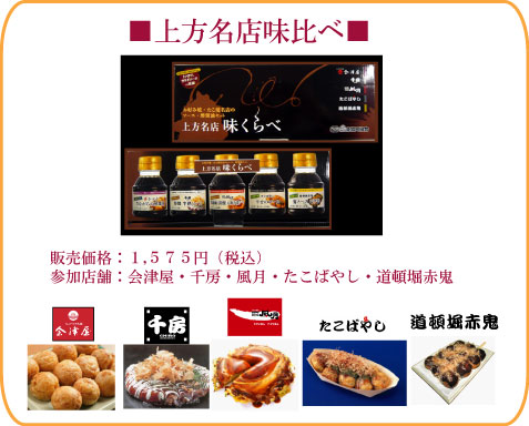 大阪の思い出を持ち帰るもよし、回りきれなかったあの店の味を家で味わうもよし、大阪コナモン名店の味をあれこれ食べ比べられる、大阪土産の決定版です!!