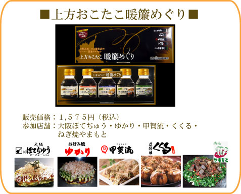上方お好み焼たこ焼協同組合では、大阪のお好み焼・たこ焼名店10店舗の秘伝のソースがセットになった「おこたこソースセット」の販売を開始しました。