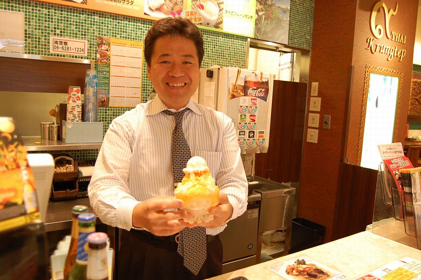 タイ風「マンゴーかき氷」(400円)は、かき氷に、社長自ら原価を無視して