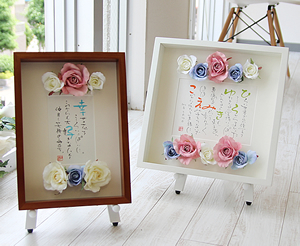 ●シルクフラワーでできたきれいなバラが名前詩といっしょに入り、落ち着いた木製の額に額装してお届けします。プレゼントした後もお家にインテリアとして飾っていただけます。