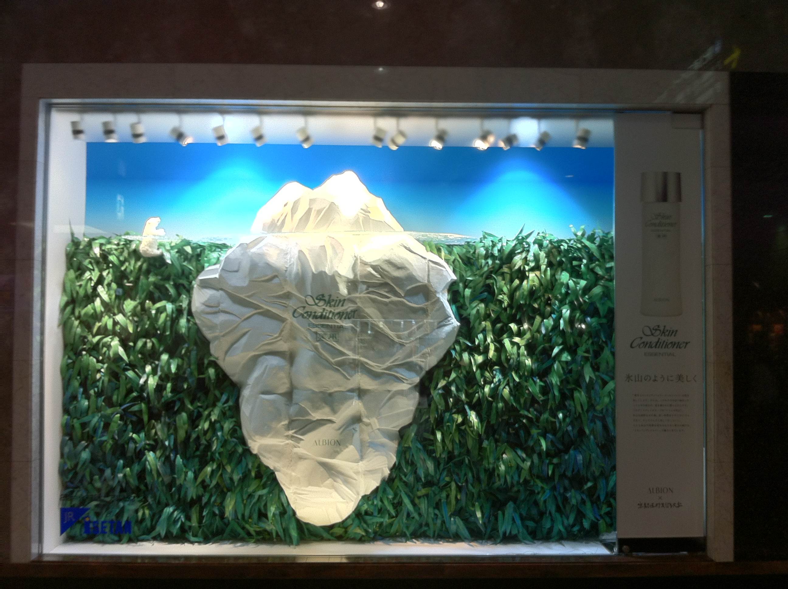 ウインドウディスプレイは、発売から38年を迎えた「薬用スキンコンディショナー エッセンシャル」の商品をテーマに、長い時間をかけて壮大に美しくなる氷山と重ね合わせ、