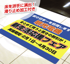 床に貼ってお客様を誘導する、玄関マット大の広告シール。