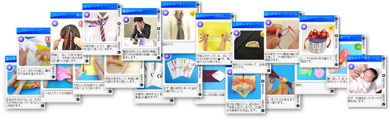 【主なコンテンツ】ヘアアレンジ~編み込み、ストール~チェーン・ノット、結婚式~のし袋の書き方、四つ穴ボタンのつけ方、タマネギのみじん切り、風呂敷~二つ包み、折り紙~餅つきうさぎ、あやとり~4段ばしご、バルーンアート~犬、ネクタイの結び方~ウインザーノット、ポケットチーフ~スリーピークスなど693(2012/8/29現在)