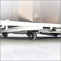 また、床下には4コのキャスターを装備し、地面がコンクリート、アスファルトであれば設置後も移動可能です。さらに1メートルのロングスロープの採用によりローダウンしたバイクでも安心して入出庫できます。