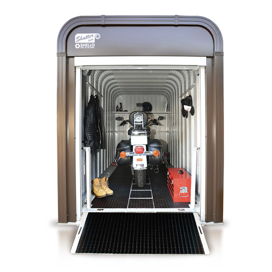 『シャッターシェローエボリューション』は、ボディー及びシャッターの色の組み合わせにより231通りのカラーバリエーションが可能で自分だけのガレージを作成することが可能です。防犯性にも大変優れており、前面シャッター部を破壊されても、スロープを南京錠でロックできるシステムにより盗難からバイクを強力に守ります。