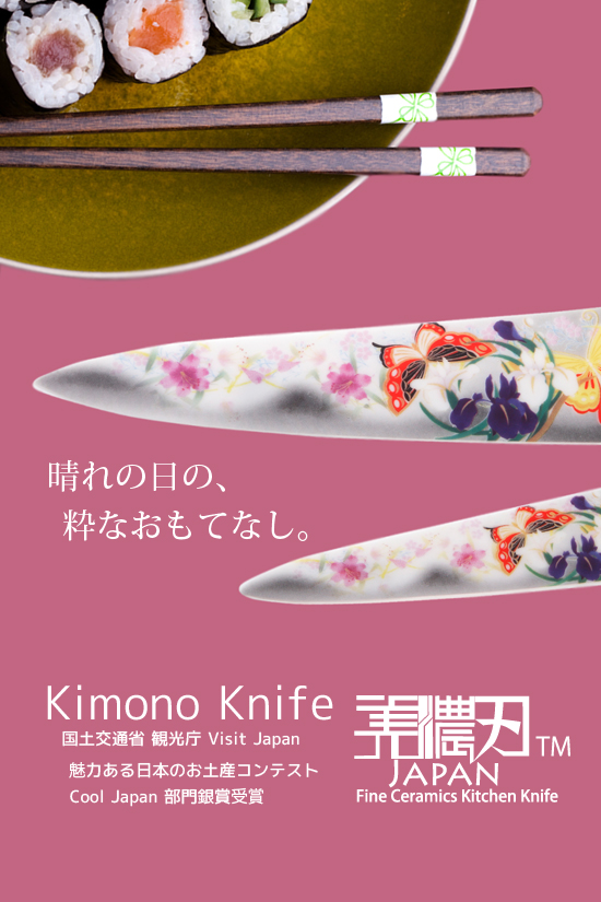 「美濃刃 Kimono Knife」は、セラミックス本来の焼き物としてのデザインの可能性を掘り下げ、ファインセラミックスのブレードに、陶磁器で使われる上絵付け技法(800度で焼付け)で友禅調の華やかな絵柄を加飾。人の集まる場所を華やかにする、おもてなしに最適なナイフを実現しました。更に、熟練の刃物職人(有限会社十三秀刃物製作所・岐阜県関市)が丁寧に仕上げることで質感と精度感、抜群の切れ味を実現しました。