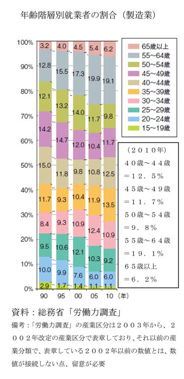 「総務省の労働力調査」によると、現在、製造業で働く中高年・シニア世代の割合は、ほぼ半数を占めています。