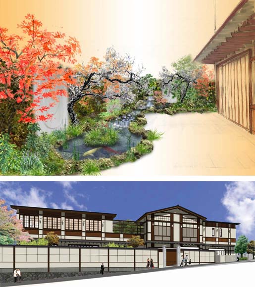これまでのゲストハウスにはない、年中花が咲き誇る日本庭園を実現。メインに植栽したのは「松」、そして「紅葉」と「梅」。結婚式に華を添える「ウメ、サルスベリ、ツバキと多種多様の実もの、花もの」なども季節に応じて咲き誇る。小川を作り、蛍を放流。6月ごろには蛍の光を鑑賞できる予定。