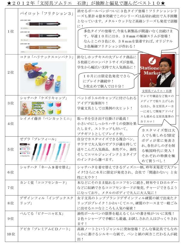 大阪・なんばの地下街「なんばウォーク」にある文房具店「ステーショナリーマーケット なんばウォーク店」(大阪市中央区千日前1丁目なんばウォーク 5-5号)の店主で、「文房具ソムリエ」としてテレビや雑誌などで活躍する石津 大(いしづ ひろし)はこの度、2012年の人気文房具ベスト10を発表致しました。