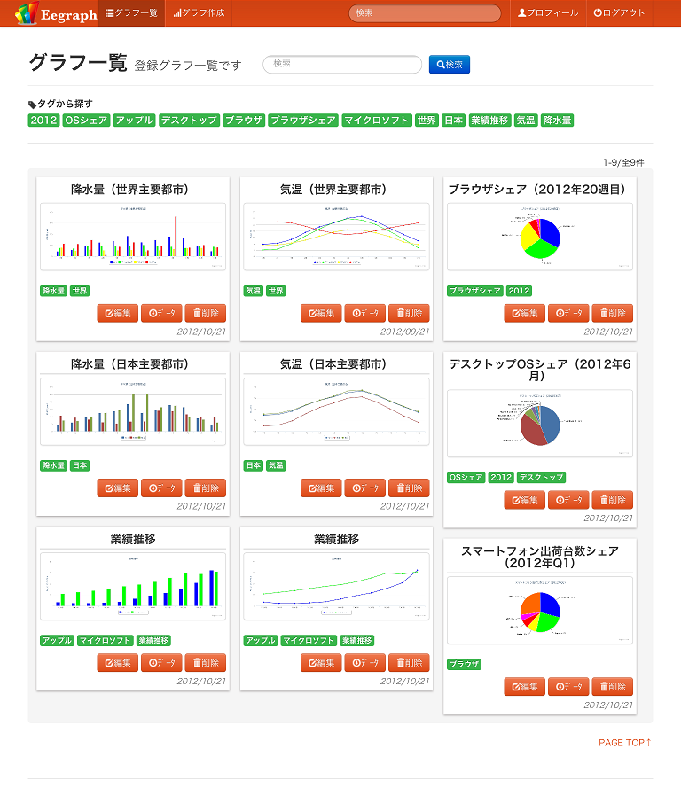 Eegraphは、無料で利用できるグラフ作成サービスです。わずか3ステップで、簡単に美しいグラフが作成でき、グラフをたくさんのエクセルファイルで管理するのではなく、Eegraphでグラフを一元管理することで、各グラフの検索作業や、グラフから見て取れる、データのパターンを解析する作業も、ずっと容易になります。