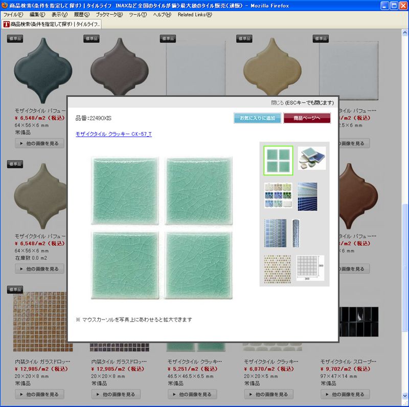 これにより、アウトレット品の低価格訴求だけでなく、標準品の商品訴求を強化することで、低迷するタイル市場の需要喚起に役立つインターネットツールにも成りえます。