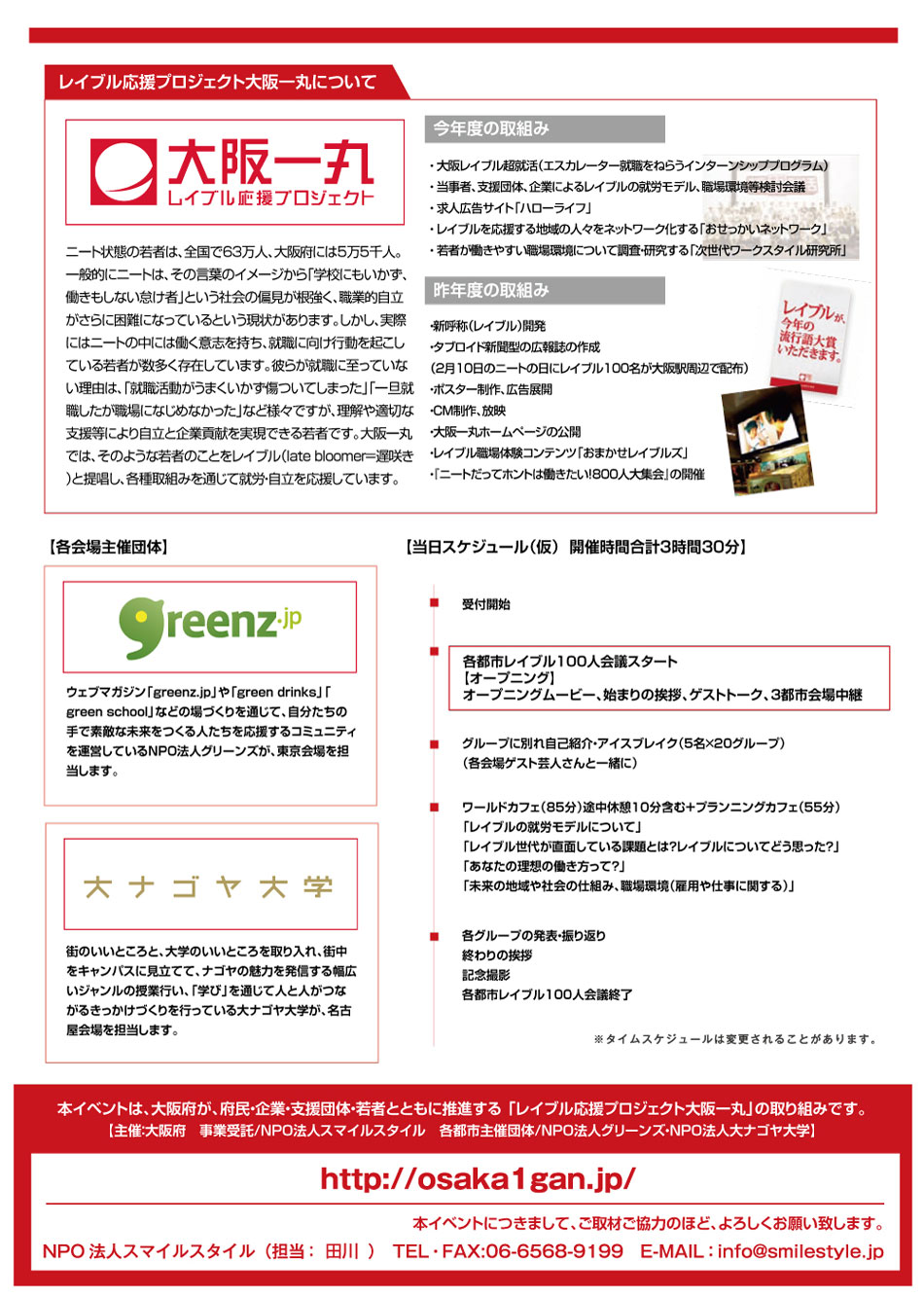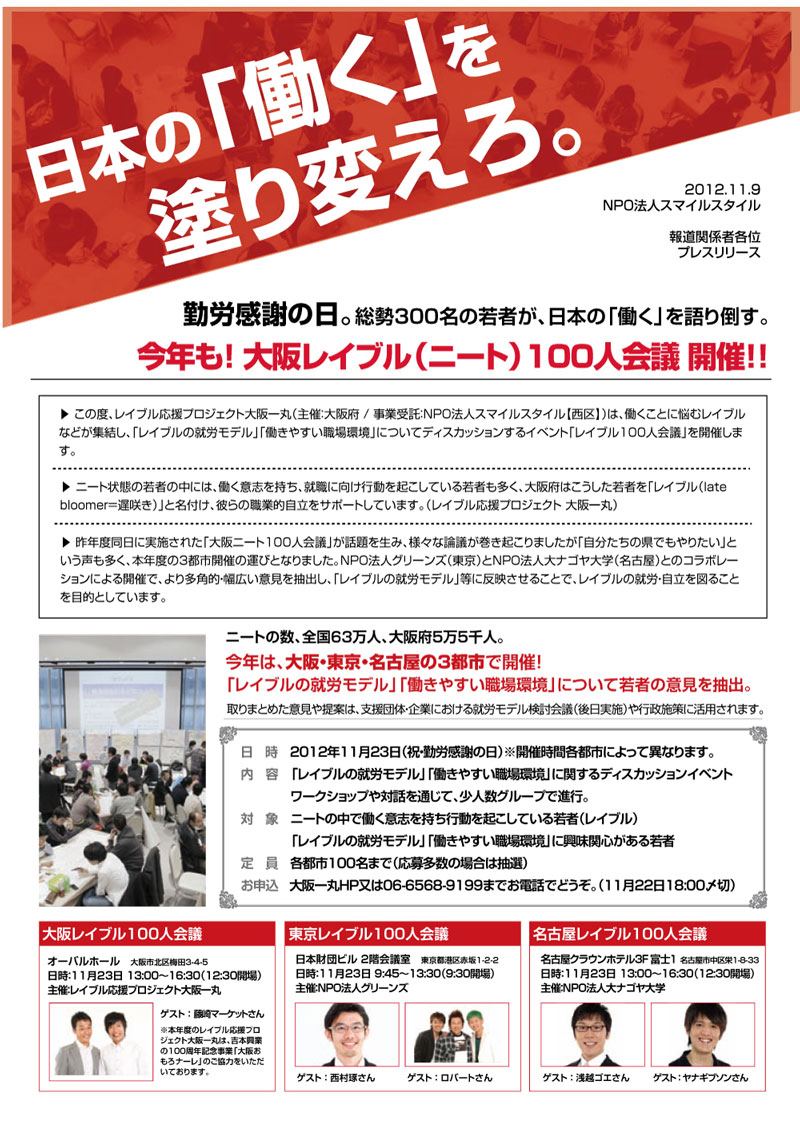 昨年度実施された「大阪ニート100人会議」が話題を生み様々な議論を巻き起こしたことで、「自分たちの県でもやりたい」という声が多くあがり、本年度は大阪・東京・名古屋での三都市同日開催の運びとなりました。