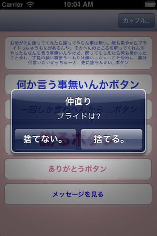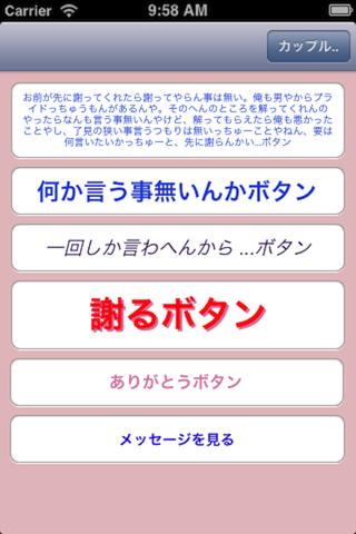 新アプリには、素直に「謝るボタン」や「ありがとうボタン」のほか、「なんか言う事無いんかボタン」、「一回しか言わへんから・・・ボタン」、二人の楽しかった思い出の写真などを添付してメッセージを伝えるなど6種類を用意し、「ワンクッション」ならぬ「ワンアプリ」を挟むことで、冷静に素直に気持ちを伝えることができます。
