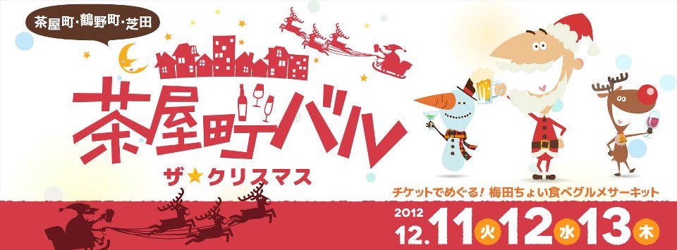 茶屋町・鶴野町・芝田エリア一帯で、2012年12月12日に開催されるキャンドルナイトに合わせて、12月11日~13日の3日間、人気飲食店の味を気軽に食べ歩ける、まちバルイベント「茶屋町バル・ザ・クリスマス」を開催致します。
